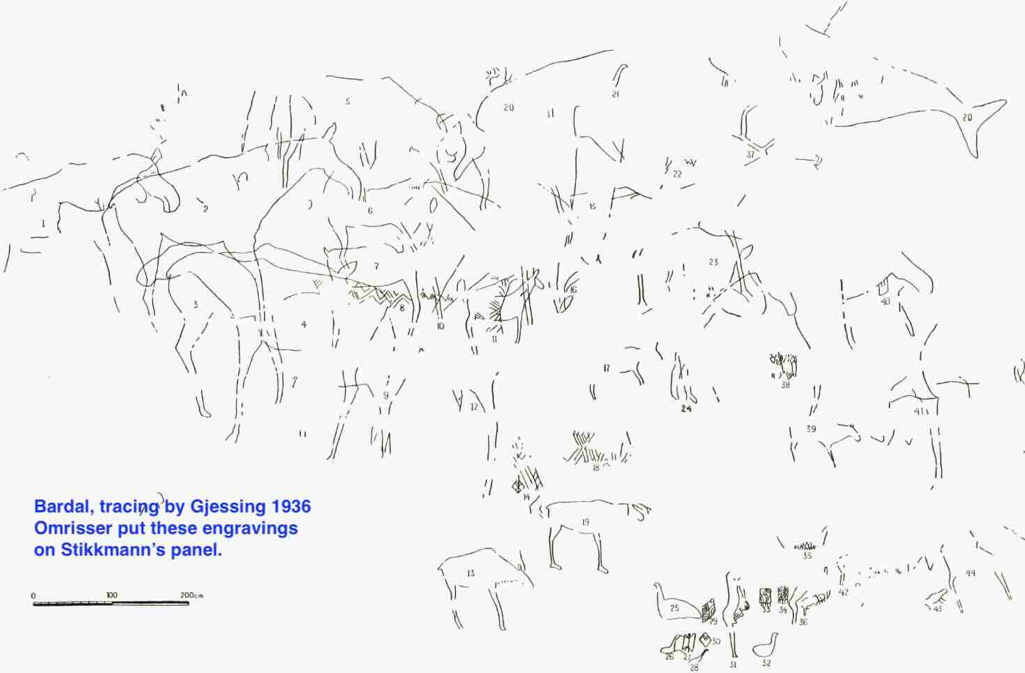 Although boats are missing, Stikkmann repeated many of the motifs that he had used in BohuslŠn. There are hundreds of cup glyps, hundreds of shoe prints, Camunian swastikas, men with small heads, long necks, and arms up, men with spears, dueling men, men standing on horses, plowing scenes, standing birds, dogs chasing deer, deer with penises, and more.