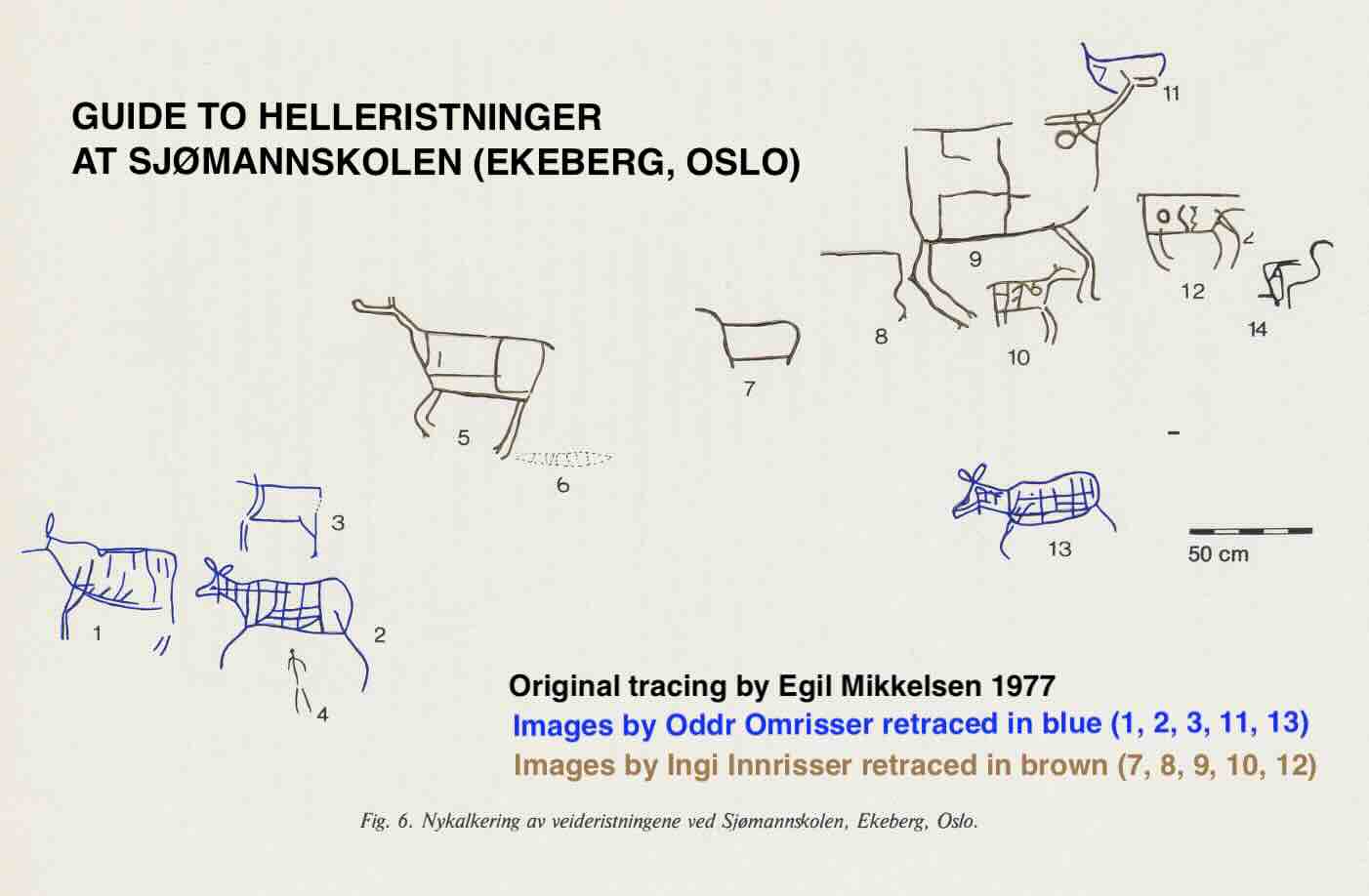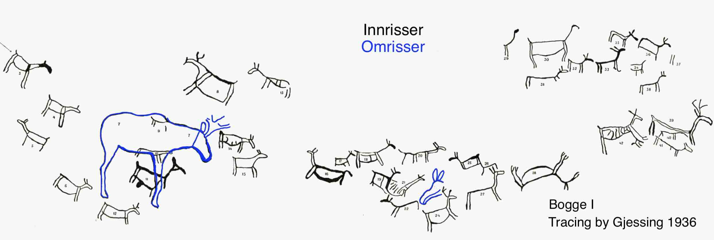 Innrisser and Omrisser took a long trip to eastern Norway (Oslo and Drammen), probably following one river valley south, and another back north. Innrisser added shoulder humps to his deer at some of those sites, such as at Skogerveien. See the tracing below by Egil Mikkelsen (1977).