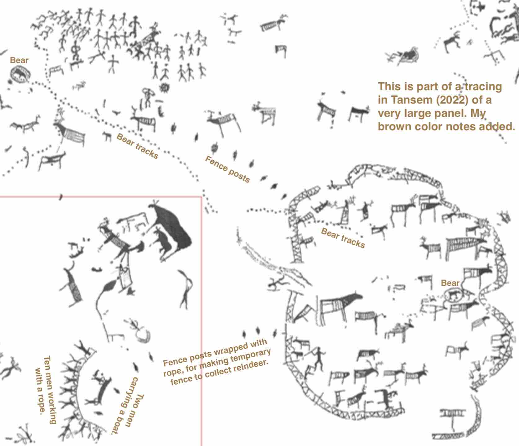 Innrisser's best work, and one of his last, was the large panel at KŒfjord near Alta. Part of that panel is shown below, in the tracing by Karin Tansem (2022). It shows a bear that has wandered into a corral of herded reindeer. Innrisser was documenting S‡mi culture, as we know it today.