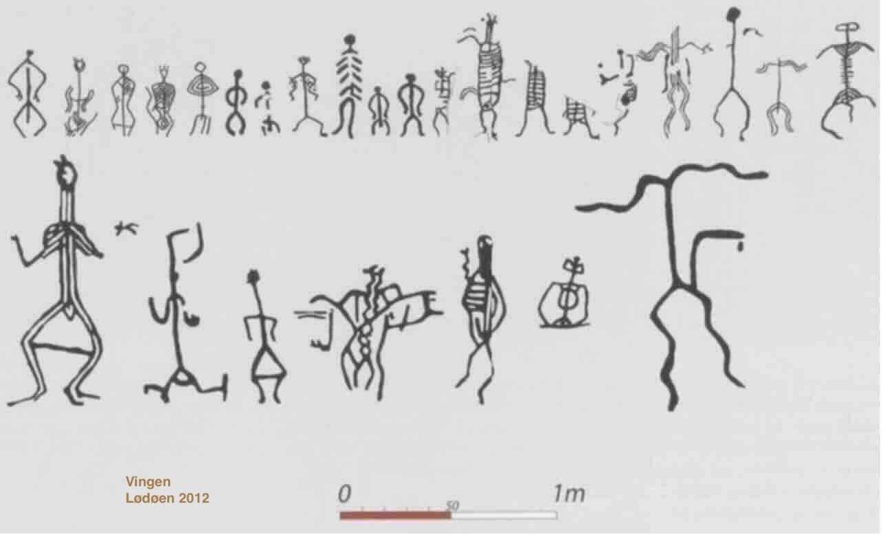 Innrisser took a long trip to northern Norway. I think he showed Oddr Omrisser how to engrave rocks at Tennes and Alta (Storsteinen and Amtmannsnes) during that trip. His next major work was probably at Ausevik near Vingen. His human figures at Vingen, Alta, and Ausevik are all wildly abstract. So are many of his deer at those places. He was experimenting with creative ways of drawing. In the picture below, Trond L¿d¿en (2012)) has put together 27 of the 61 humans at Vingen. No two human images are alike.