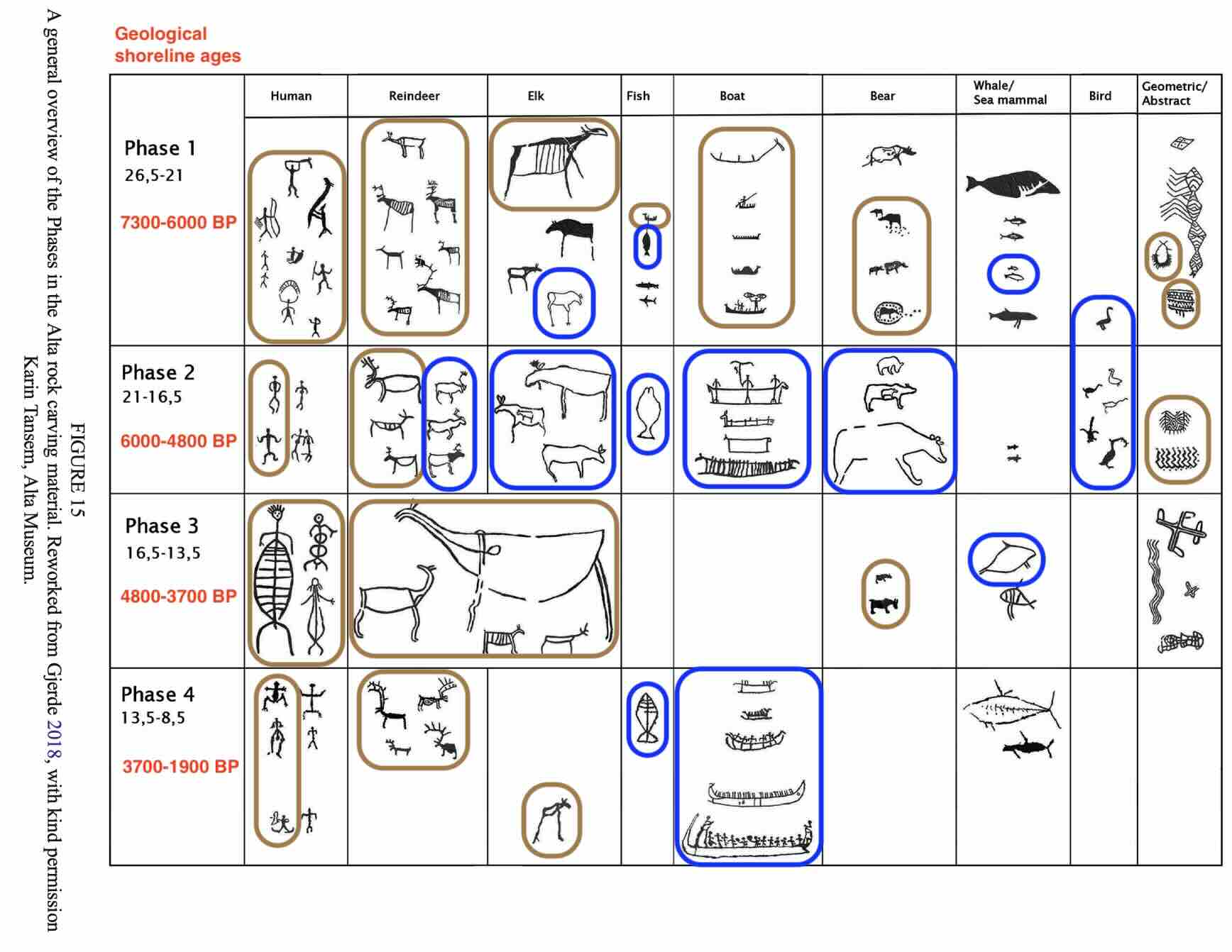 At many petroglyph sites, images high on a hillside are said to be hundreds of years older than similar images a few meters lower down. At Alta, the age difference is said to be over 5000 years. The figure below, from a publication by Jan Magne Gjerde (2024) shows the four supposed phases of rock art at Alta that were established in a publication by Knut Helskog (1988). I have added in red the years BP (Before Present) that are claimed for those phases. The ages apply only to the ancient shore levels, not the images. I ignore the elevations of Alta images, and can identify most of them as the work of either Innrisser (brown) or Omrisser (blue).