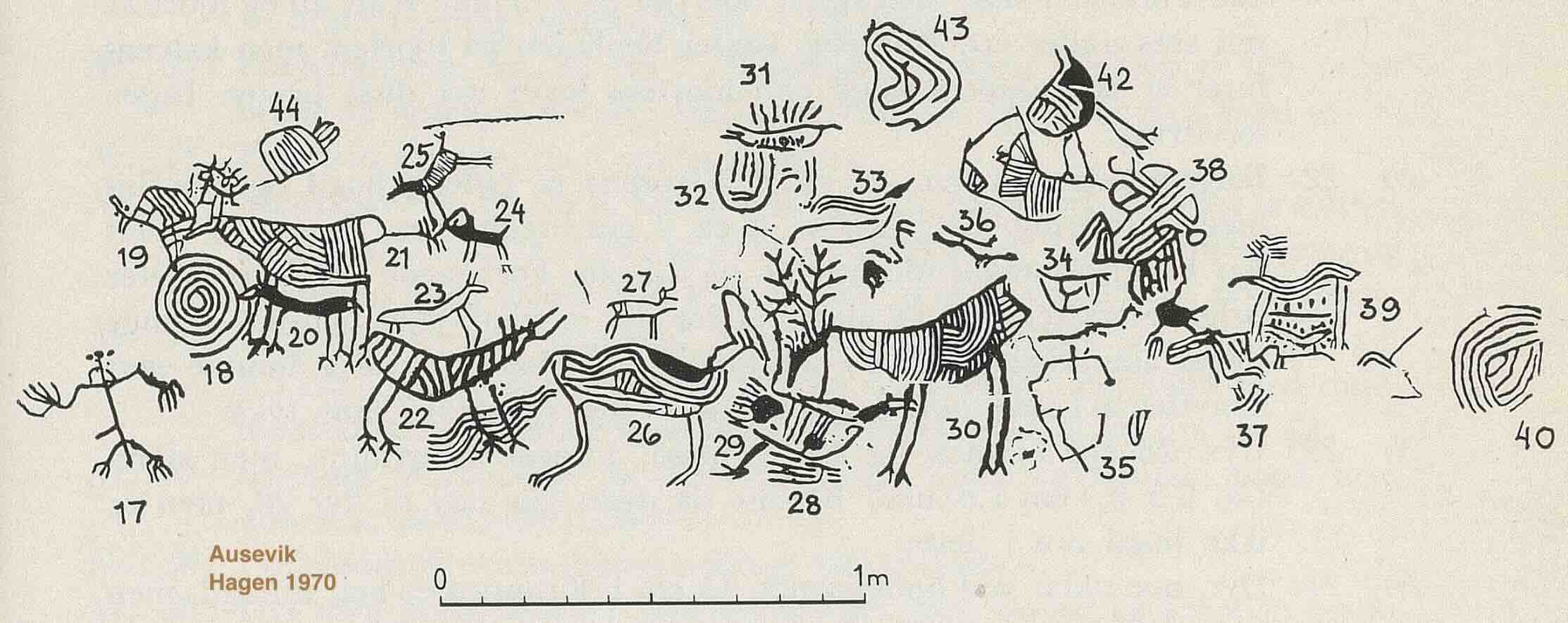 The tracing below by Anders Hagen (1970) of a panel at Ausevik shows one abstract human and about 13 deer. Innrisser also drew these images during his early experimental phase.