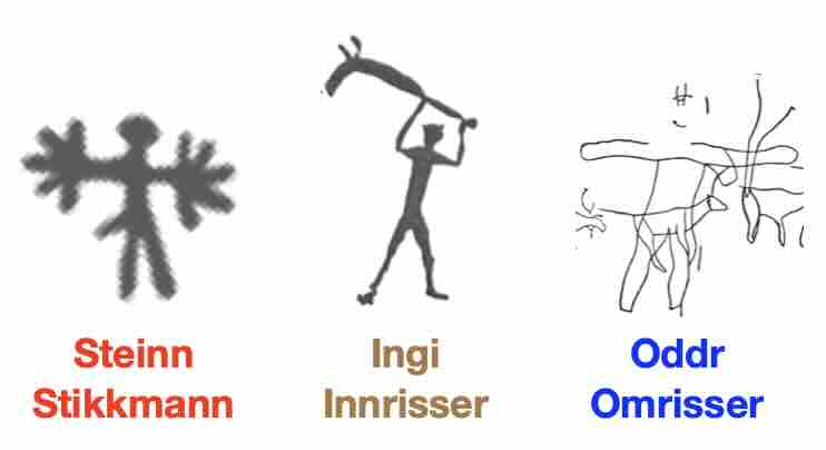 Stikkmann, Innrisser, and Omrisser were artists. Stikkmann was also a tagger. His figures sometimes tell stories, but the scenes are difficult to interpret. Innrisser was also a storyteller, documenting human and animal activities. Omrisser was a naturalist, trying to make good likenesses of many types of animals. We can imagine that the three artists also drew on other materials that have not survived.