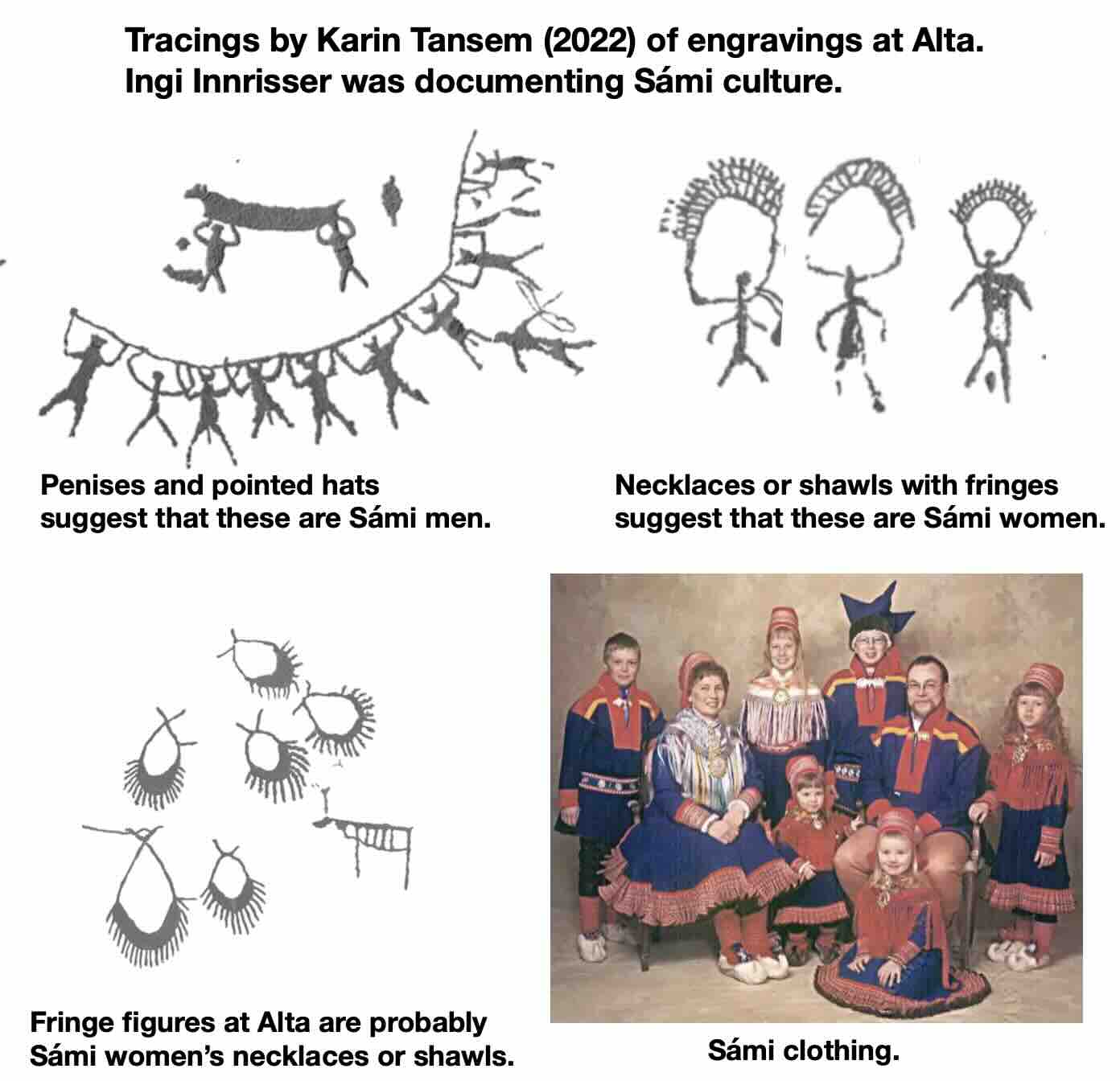Innrisser's panels at KŒfjord and Bergbukten (Alta) are especially important, because they are some of the earliest documentation of S‡mi culture. He showed reindeer in corrals, and S‡mi clothing items. The traditional clothing of S‡mi men in the Alta area includes a hat with points. The traditional clothing of S‡mi women includes a shawl with fringes. (Innrisser showed the boat, rope, and shawls up in the air to be easily seen.)