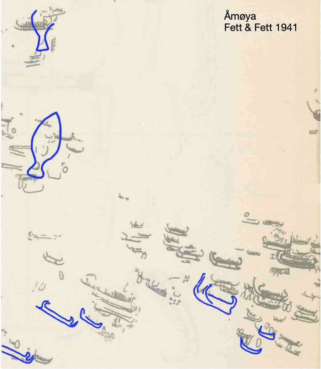 Below on the left is a tracing by Eva & Per Fett (1941) of a panel at Stavanger (m¿ya). It shows typical boats and shoe prints by Stikkmann. Omrisser defaced the panel by putting a few images (which I have changed to blue) on top of Stikkmann's images. Omrisser was copying Stikkmann's boats, to learn how to draw outlines of that boat type. He then made a 5.5 meter boat nearby. On the right is a tracing by Tansem (2022) of a panel at KŒfjord by Innrisser. Omrisser defaced the panel by putting several images on top of Innrisser's images. Note that Omrisser drew the same fish at Stavanger and KŒfjord, and the deer-head at KŒfjord is the same as at Bogge. He made that distinctive deer-head (often without the body of the deer) at many places in Norway and Sweden.