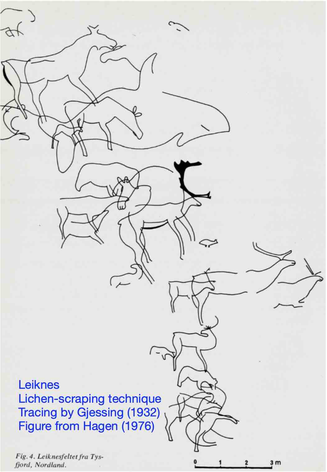 Omrisser used four different techniques during his career. He started with red ocher stain, but mostly he used the nailpoint technique. On two panels of soft rocks (at GŠrde and Hell) he used the point of a knife. Late in his career, at the peak of his anatomical drawing skill, he discovered that he could quickly and easily make large petroglyphs by scraping away black lichen that covers the surfaces of glacially-polished white granites. Using that technique he made life-sized and lifelike images of animals at seven known sites in Nordland: Leiknes, Fykanvatn, Mj¿nes, Nes, Sagelva, Valle, and m¿ya.