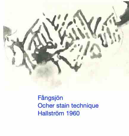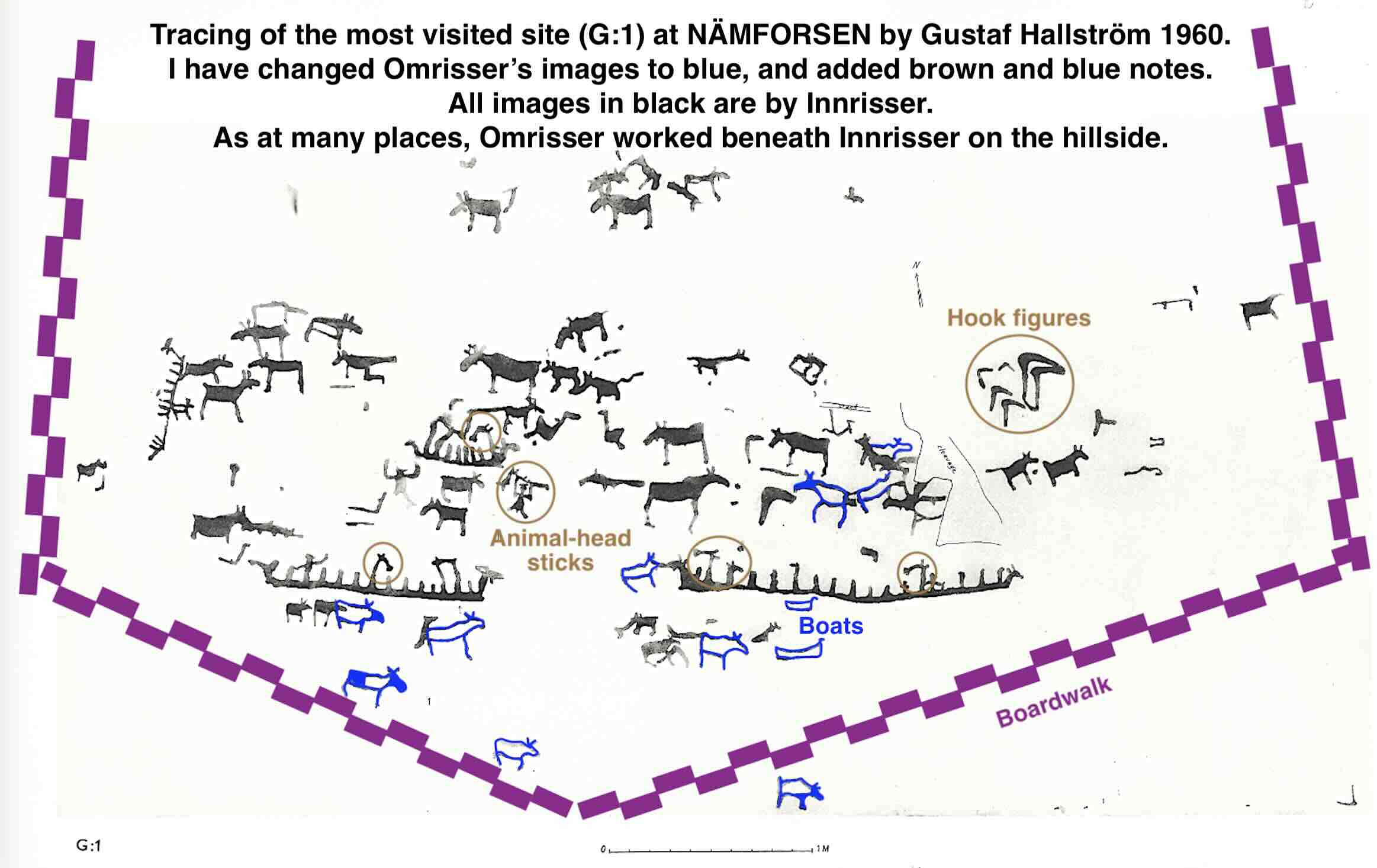 Early in his career, before Innrisser taught him to engrave, Omrisser painted rock panels at dozens of sites in northern Sweden. He also painted at a few sites in Norway. He painted with red ocher pigment, probably mixed with fat that penetrates the rock surface, leaving red traces that are still visible after more than a thousand years. (If there are oil stains on your kitchen's granite countertop, they may also last a thousand years :-) He must have worked during the winter or spring in Sweden, when he could stand on ice-covered lakes and paint rock panels at the lake edge. Later, he also stood on frozen lakes to make engravings. I suspect that he was born south of Stršmsund Sweden, where there is a cluster of rock paintings, all within skiing distance from each other. They are not far from NŠmforsen, where he and Innrisser worked together making nailpoint petroglyps. Their engravings at NŠmforsen are quite similar and difficult to distinguish.