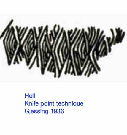Steinn Stikkmann discovered how to use a nail as a stabbing tool (stikkvŒpen) to peck the soft rocks in Gauldalen, central Norway. He practiced nailpoint engraving by making round cup glyps (cup marks) and sets of matching shoe prints that never show a pattern of walking. He also tried engraving with a knife point. Archaeologists have noted that the petroglyphs in Gauldalen are relatively crude. One of his first figurative panels, with boats and cup glyps, is seen below (Fig. 82 in Marstrander & Sognnes 1999).