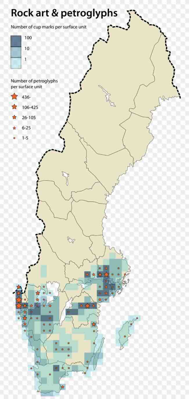 The map below from The National Atlas of Sweden shows the distribution of petroglyphs and cup marks registered before 1994. Curiously, the eight sites in northern Sweden (engraved by Omrisser and Innrisser) are not shown. The complete absence of cup marks in central and northern Sweden suggests that Stikkmann never went to northern parts of Sweden.