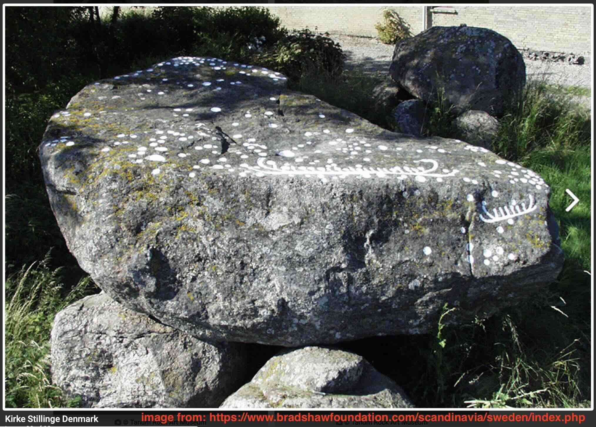 Stikkmann wandered all around Denmark, looking for hard bedrock panels to engrave. He could not know that there is no bedrock exposed anywhere. Soft sedimentary rock layers cover the entire country. He did find large stones. Except for flint nodules, the stones in Denmark were brought there by Ice Age glaciers from Norway and Sweden. He tagged over 500 stones with cup glyps, but made very few figurative engravings. About 30% of the stones he chose had been arranged or stacked at Bronze Age graves. Stikkmann typically tagged the capstone or some other prominent stone.