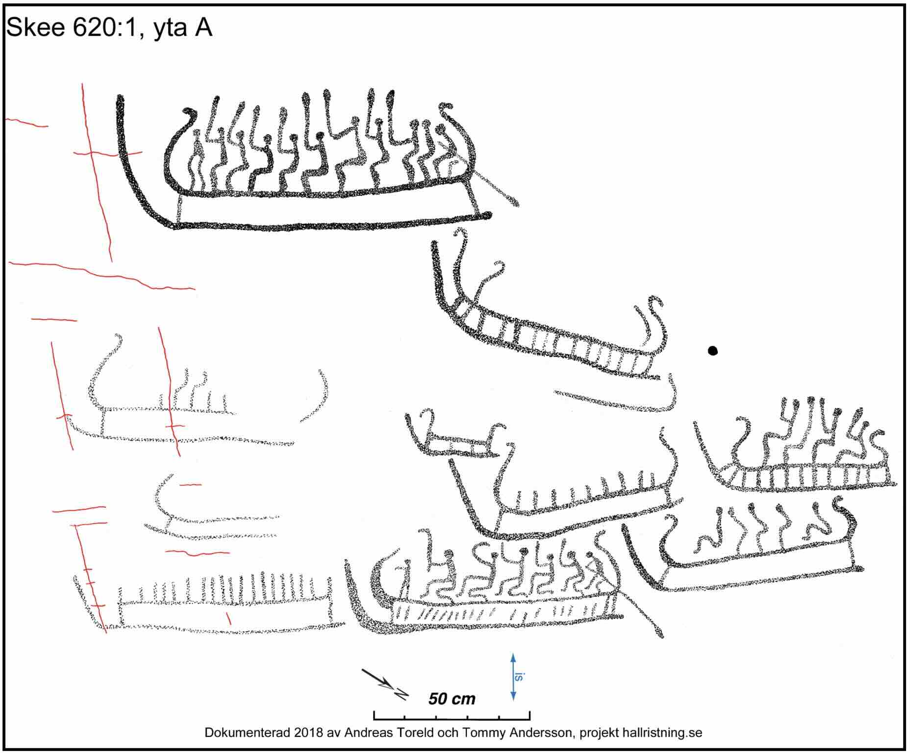 RaŠ Skee 620 in BohuslŠn. Fleets of boats routinely went on long journeys during the petroglyph times. The travelers may have been trading Nordic amber for Mediterranean bronze.