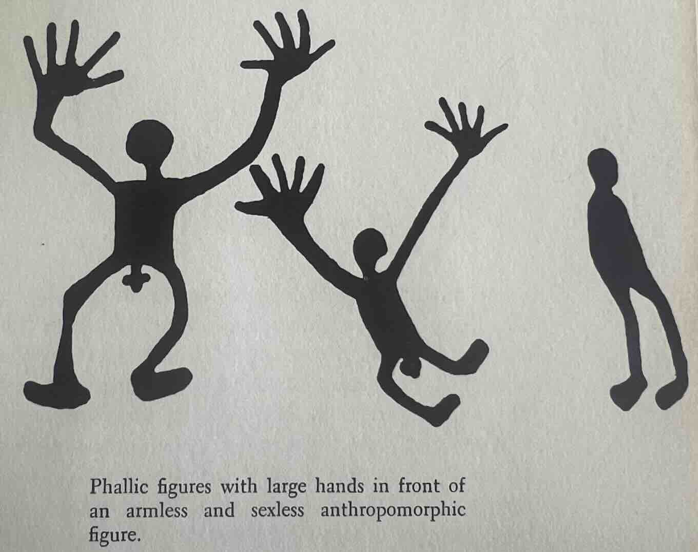 Stikkmann's phallic men in Scandinavia are said to indicate a fertility cult, and at Valcamonica they are said to indicate ithyphallic deities. But showing penises, and the arms-up-fingers-spread pose, were probably meant to indicate vitality and power. Stikkmann engraved the same composition at Tanum and Valcamonica, showing two powerful men and one powerless man.